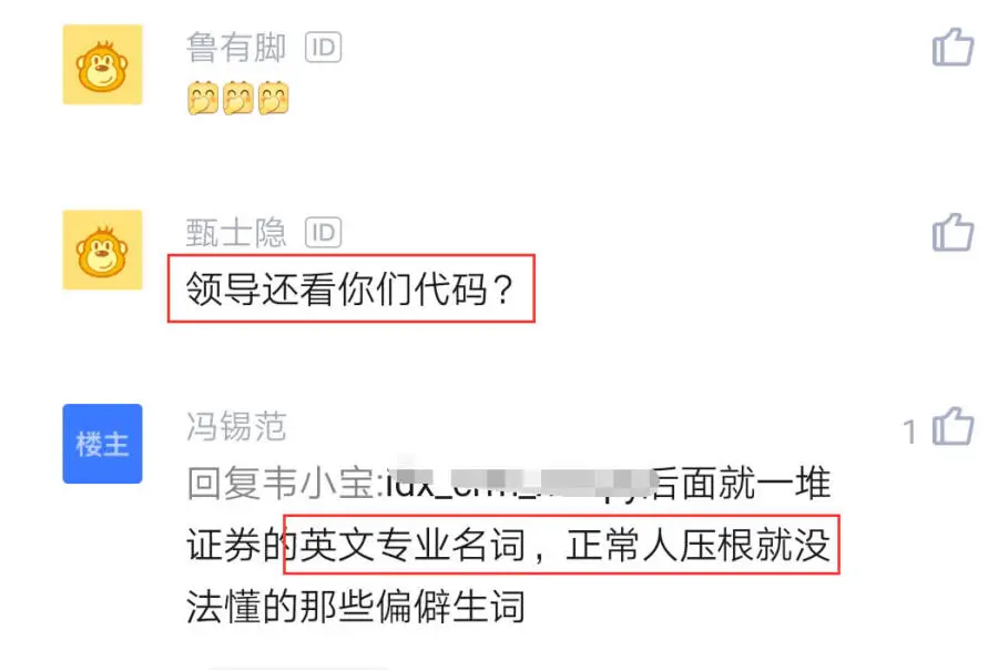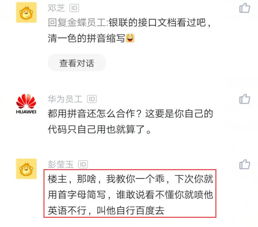 原来这个程序员做的是金融行业方面的工作,由于做的这个产品功能实在有点奇葩,一时半会没有想到怎么给产品取个英文名。该员工最后想了个办法,那就是用中文拼音写。可是在昨天开会的时候,有个领导当时在群里就骂这个程序员,取个名字都不会。
