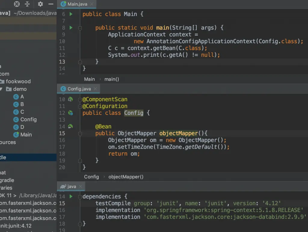 配置文件是Config.java,它有一个@Configuration注解,这表明Config类是配置类。它还有另外一个注解@ComponentScan,这个注解表示容器应该去扫描程序的代码,看看那些组件应当被初始化为Bean。哪些类会被初始化为Bean呢?我们看看ABCD的源码,发现他们各自都有注解@Component,这个注解就表示了它所在的类是组件,需要初始化Bean。C和B的成员变量都用@Autowired注解来修饰,这样容器就知道他们都依赖哪些Bean了,ABCD的对象都生成好之后,容器就把D对象赋值给B的成员,把A和B的对象赋值给C的成员。