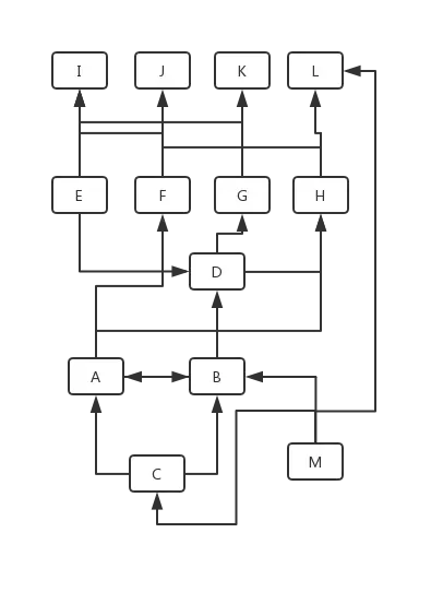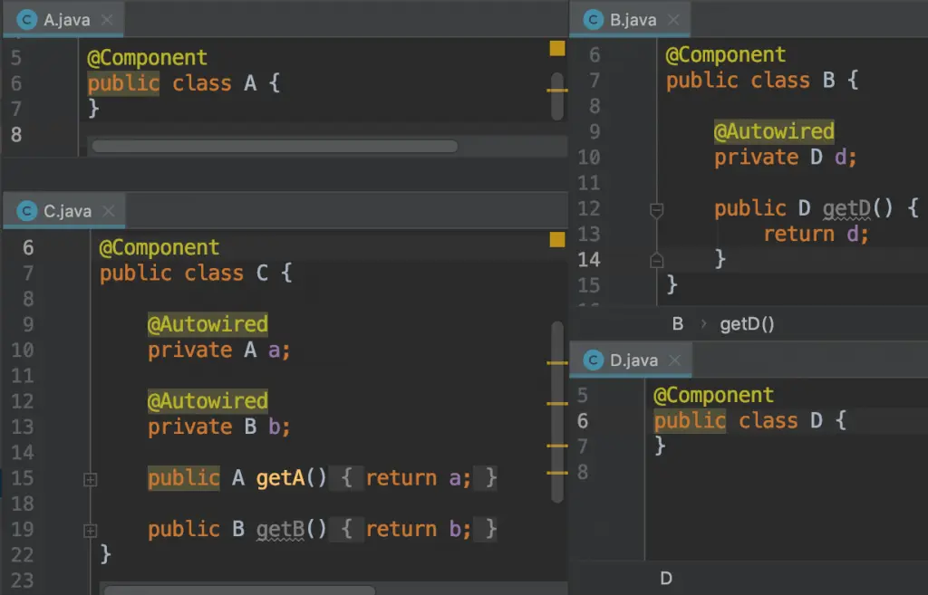 在一个系统里,可能有多个业务部分,比如用户服务,订单服务,数据服务等等,在代码里,这些服务也许分布在多个类中,可能叫做UserService或者OrderService等等。为了简便,我们假设系统里有A、B、C、D四个类,他们有如下的依赖关系: