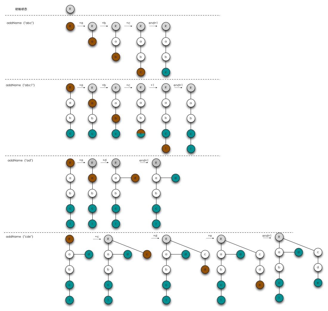 - addName:向树中增加一个新的文件名,即参数name。以root为起点,name中的每个字符作参数调用addChild,返回值又作为新的起点,直到name中的全部字符添加完毕,对最后一次调用addChild的返回值标记为结束节点。