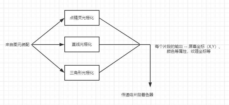 在此阶段绘制对应的图元(点精灵、直线或者三角形)。光栅化是将图元转化为一组二维片段的过程,然后,这些片段由片段着色器处理。这些二维片段代表着可在屏幕上绘制的像素。