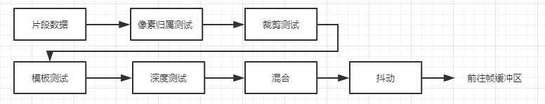 在这个阶段中会对一个片段进行各种测试,来决定它是否可见。如果一个片段成功通过了所有测试,那么它就会被直接绘制到帧缓存中了, 它对应的像素的颜色值会被更新,如果开启了融合模式,那么片段的颜色会与该像素当前的颜色相叠加,形成一个新的颜色值并写入帧缓存中。