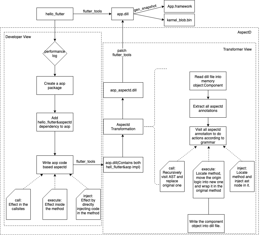 虽然我们可以通过编译aop.dart达到同时编译原始工程代码和AspectD代码到dill文件,再通过Transform实现dill层次的变换实现AOP,但标准的flutter构建(即flutter_tools)并不支持这个过程,所以还是需要对构建过程做细微修改。
