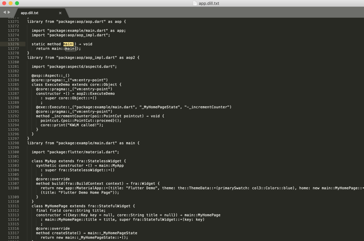 从上文可以看到,aop.dart引入import 'package:example/main.dart' as app;,这使得编译aop.dart时可包含整个example工程的所有代码。
