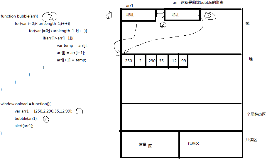 图中,当执行,①对应的代码(var arr1 = [250,2,290,35,12,99];)时,内存中会产生①对应的变化,即在栈中申请一块内存区域,起名为arr1,在堆区中申请内存空间放置250,2,290,35,12,99,并把堆区中的内存的地址赋给arr1的内存中;当执行②对应的代码bubble(arr1)时,调用函数。这时候会定义形参arr(内存中③对应的变化),即在栈中申请一块内存区域,起名为arr,并把arr1保存的地址赋给了arr(内存中②表示的赋值),这样,形参arr和实参arr1就指向了同一块内存区域。数组中的值250,2,290,35,12,99在内存中只有一份。即,不用把数组中每个元素的值再复制一份,节约了内存。如果对内存图看懂了,那么,当形参arr对应的数据顺序改变了,实参arr1对应的数据顺序也就改变了。即,实现了形参数据改变时,实参数据也改变了。所以,bubble函数不需要返回值,依然可以达到排序的目的。可以运行我示例中的代码,看看是不是达到了排序的效果。