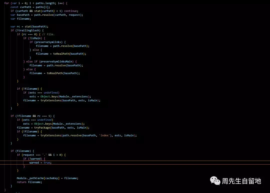 Module._findPath():判断哪一个路径为模块的真实路径我们继续先看下Module._resolveLookupPaths()源代码,由于本方法内容过多,只截取关键代码部分: