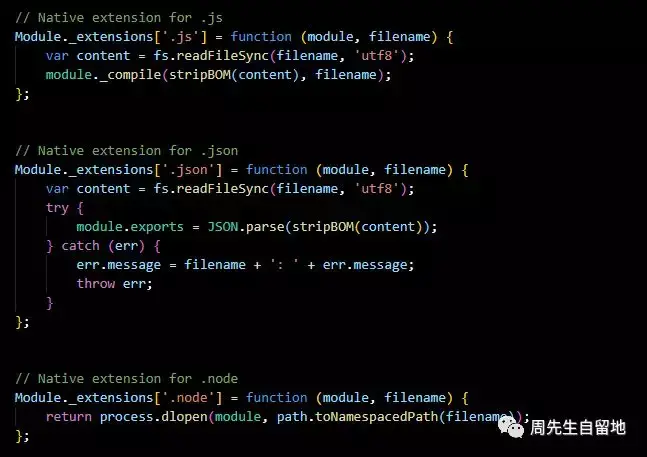 里面使用了Module._extensions[currentExtension]来针对不同后缀文件进行判断: