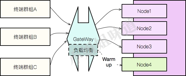 warmup最合适的切入层面就是网关。如图:node4是刚启动的节点,集成在网关中的负载均衡组件,将能够识别出这台刚加入的实例,然后逐步放量到这台机器,直到它能够真正承受高速流量。