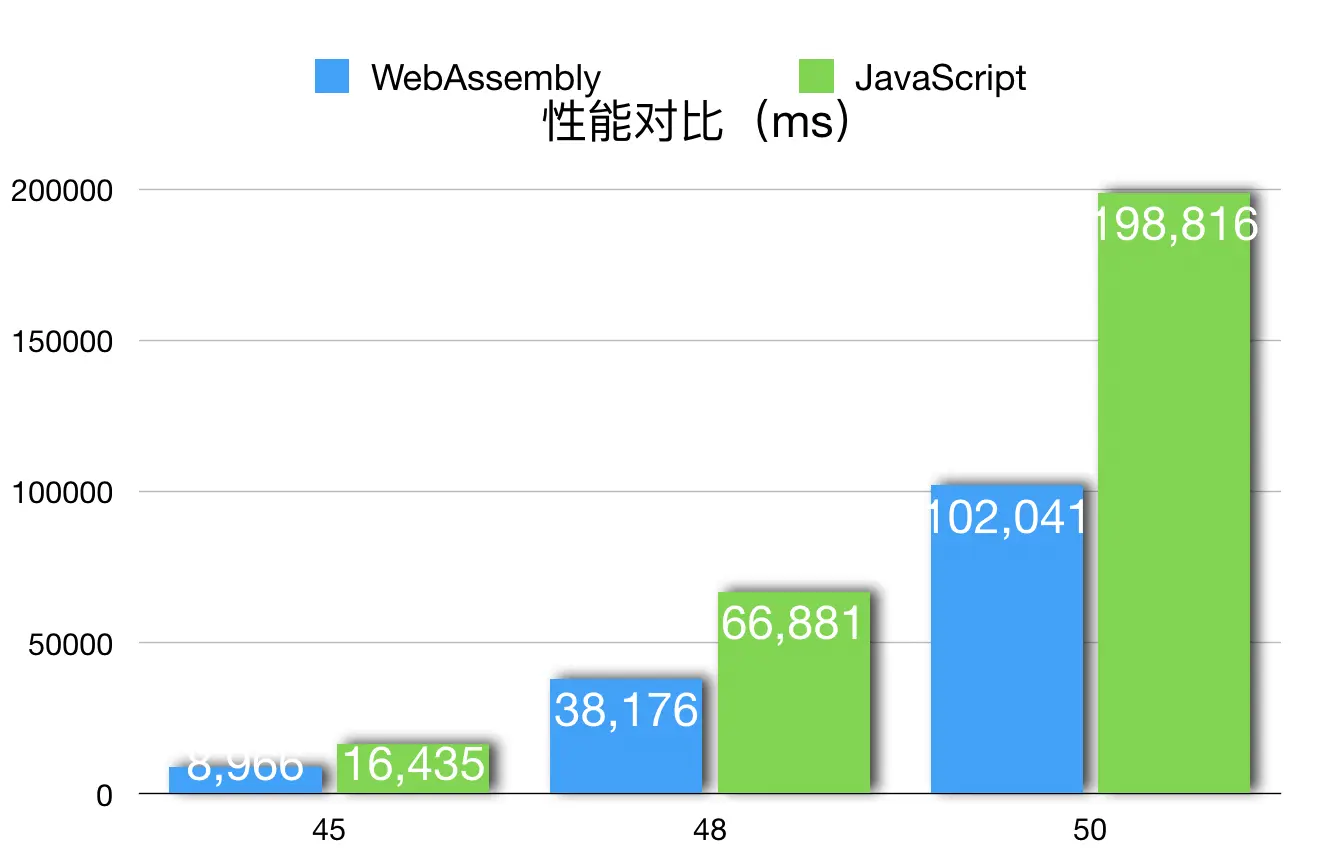 我自己在一个用create-react-app新建的项目中,分别对比了WebAssembly版本和原生JavaScript版本的递归无优化的Fibonacci函数,下图是这两个函数在值是45、48、50的时候的性能对比。