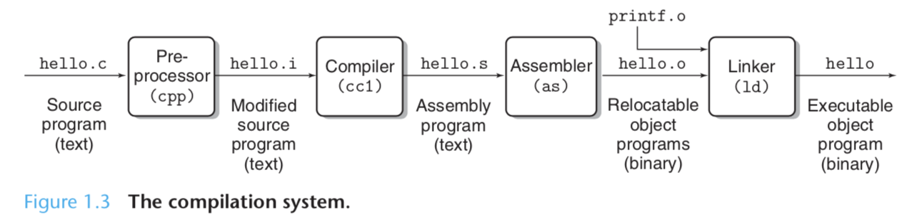 - Preprocessor phase 预处理阶段:根据源文件的头信息解析为 hello.i 格式。 Compilation phase 编译阶段:hello.i --> hello.s which contains an assembly-language program. 即将 C 编译成汇编语言程序。