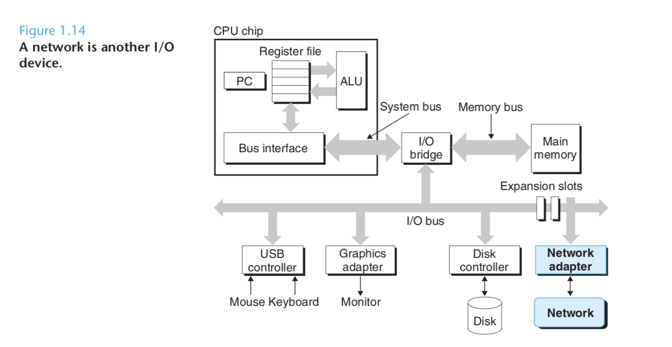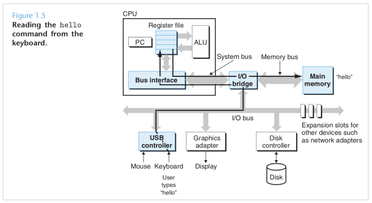 Running throughout the system is a collection of electrical conduits called buses that carry bytes of infomation back and forth between components. Bus 总线是连通整个系统所有组件的管道,各种信息数据以 bytes 形式穿行于 bus 总线中,从一个 component 传输到其他 component 进行通信。