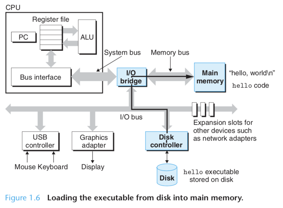 当我们按 enter 时,shell 知道我们输完命令了,shell 就将硬盘上的 hello 可执行文件加载到主内存中。(shell then load the executable hello file by executing a sequence of instructions,that copies the code and data in the hello object file from disk to main memory. )