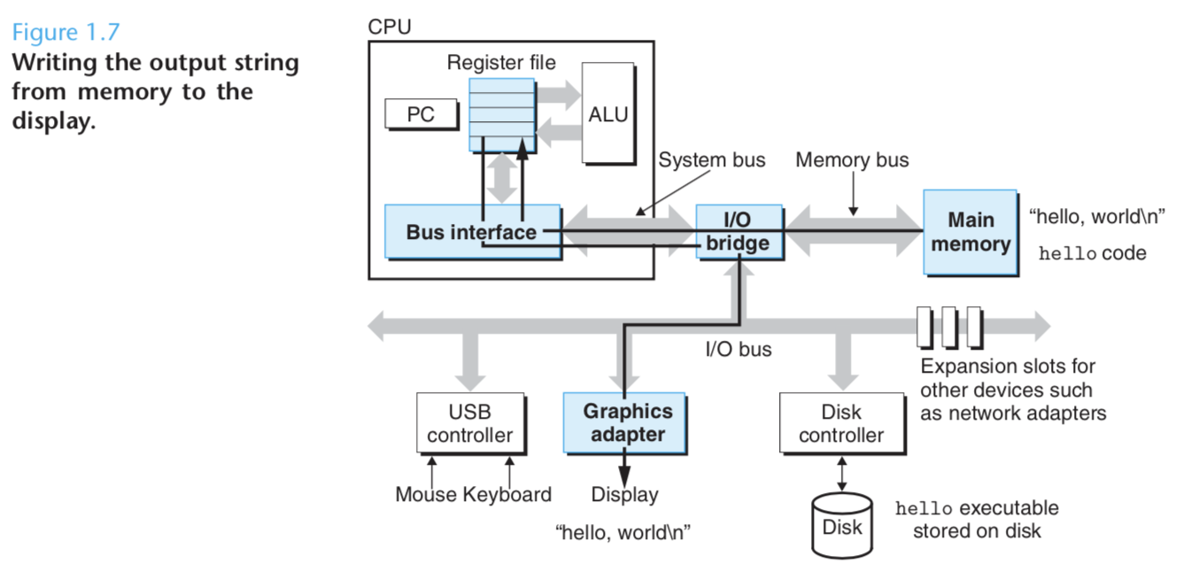 这些机器语言指令 copy the bytes in the "hello, world\n" string from main memory to the register file, 然后再到显示器,即将其显示到显示屏上。过程如下图显示: