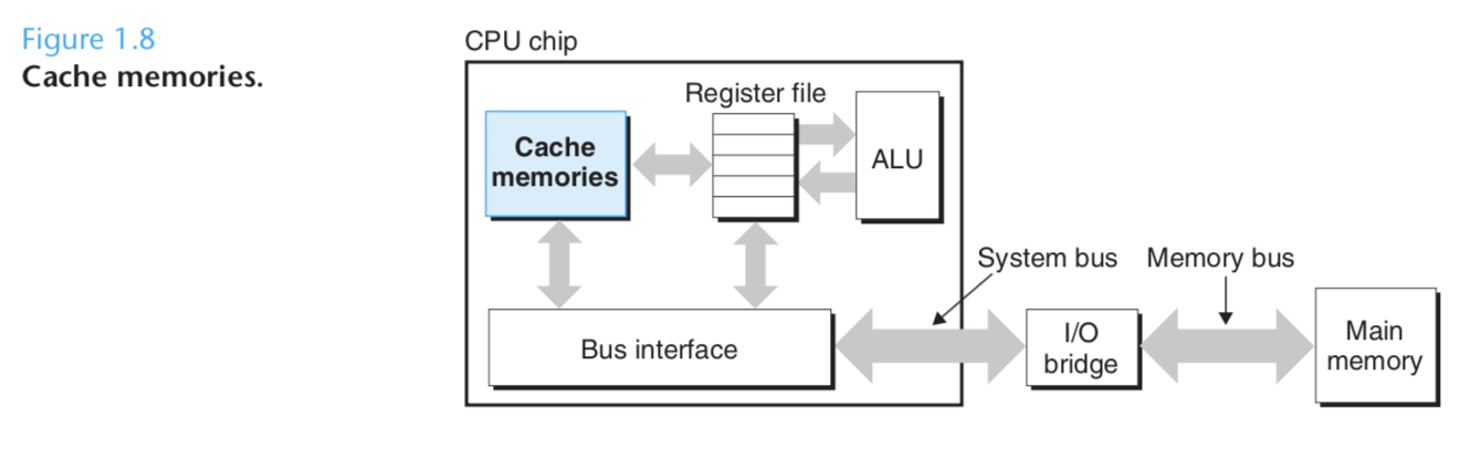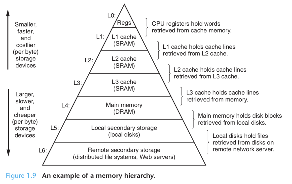 Processors read and interpret binary instructions that are stored in main memory. Since computers spend most of their time copying data between memory, I/O devices, and the CPU registers, the storage devices in a system are arranged in a hierachy. With the CPU registers at the top, followed by multiple levels of cache memories(L1,L2,L3 caches), DRAM main memory, and disk storage. Storage devices that are higher in the hierachy serve as caches for devices that are lower in the hierachy.