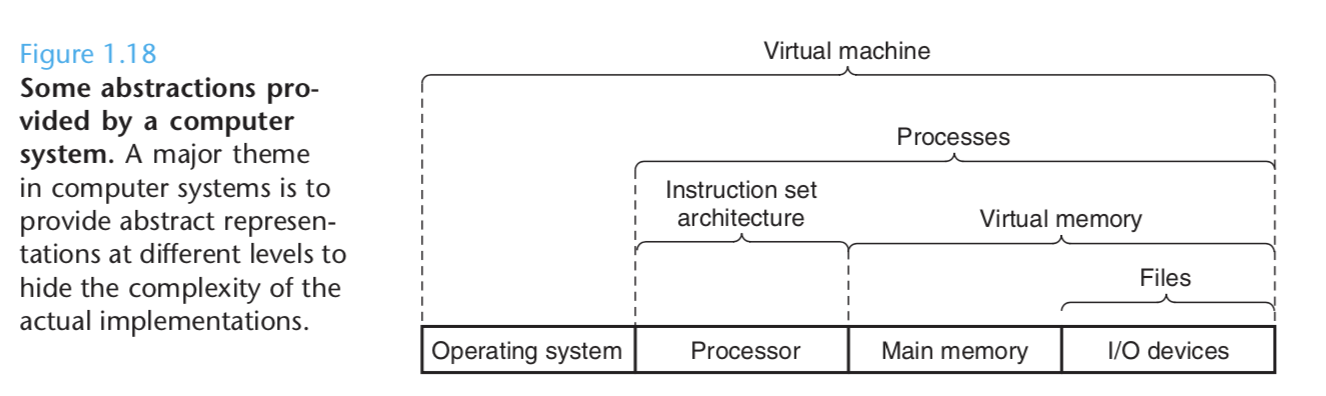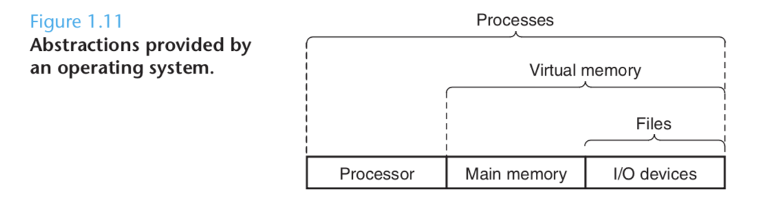 The operating system kernel serves as an intermediary between the application and the hardware. This intermediary provides 3 fundamental abstractions: Files are abstractions for I/O decvices. Virtual memory is an abstraction for both main memory and disk. Processes are abstractions for the processor, main memory, and I/O devices.
