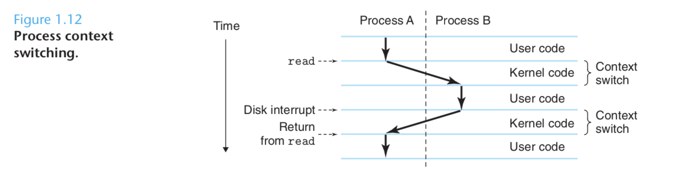 When performing context switching, processor save the context of the current process, restoring the context of the new process, and then passing control to the new process. The new process picks up exactly where is left off. 如下图所示: