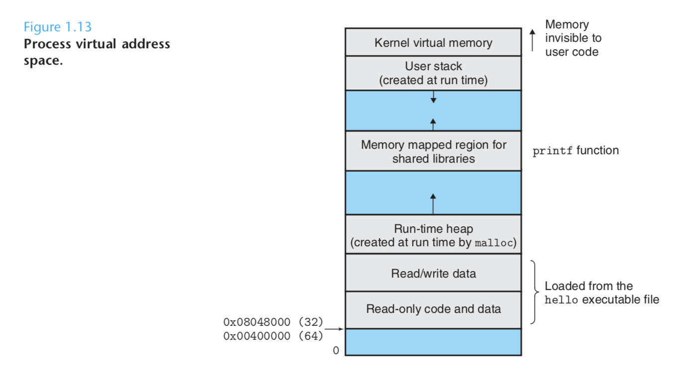 The code and data areas are initialized directly from the contetnts of an executable object file, the hello executable.