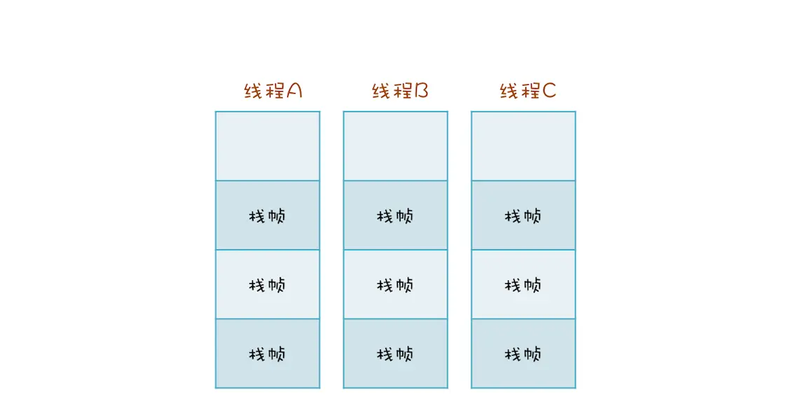 两个线程可以同时用不同的参数调用相同的方法,每个线程都有自己独立的调用栈.如果不是这样两个线程就会互相干扰了,如下图所示,线程A,B,C都有自己独立的调用栈.