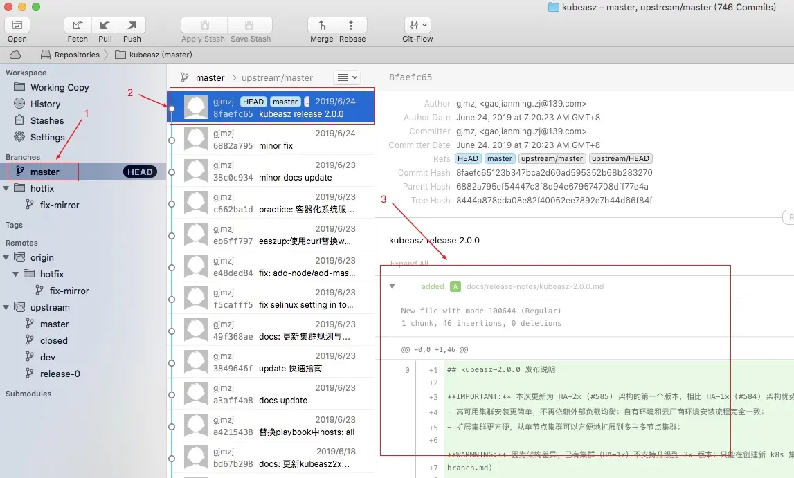单机左边栏的分支名称就可以查看这个分支的历史了,比如查看master分支历史,操作效果如下