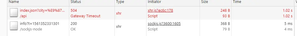 504:网关超时。但是,通过在浏览器中输入http://localhost/api/index.json是可以显示出数据的。当时就去找网上相关的帖子,尝试过在更改两头端口号以及将index.js中的locahost:80更改为127.0.0.1:80也不起作用。这里,要说明下localhost正确解释是本地服务器。127.0.0.1指本机地址或者本机服务器,windows自动将localhost解析为127.0.0.1。我在index.js中修改了target值,依然是504错误可以看出,localhost:80和127.0.0.1:80都是发送了请求的。最后回来认真查看错误原因时才想到:网关超时,客户进程一定是发出了请求,但是没有得到php服务器响应,那么问题是在php服务器端。