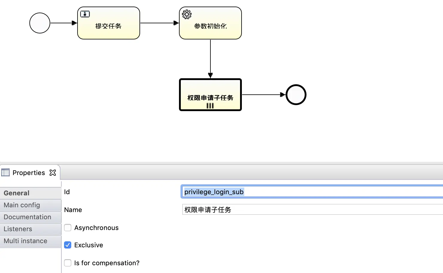 - 画一个子流程,这里不能选async,选了就跑不起来了,我的理解是调用CallActivity和执行新的子流程是不同的线程执行的,调用CallActivity只是为了生成创建子流程的job,而子流程是否异步执行是在multi instance页面配置的。