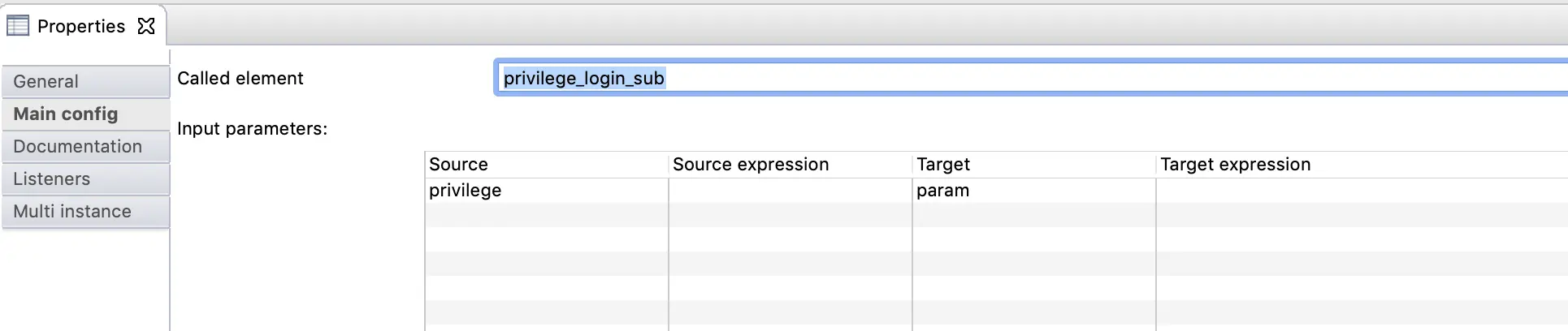 - main config页面配置要调用的子流程的process id和需要传的参数,这里参数的意思是主流程的参数名privilege传过去后叫参数名param