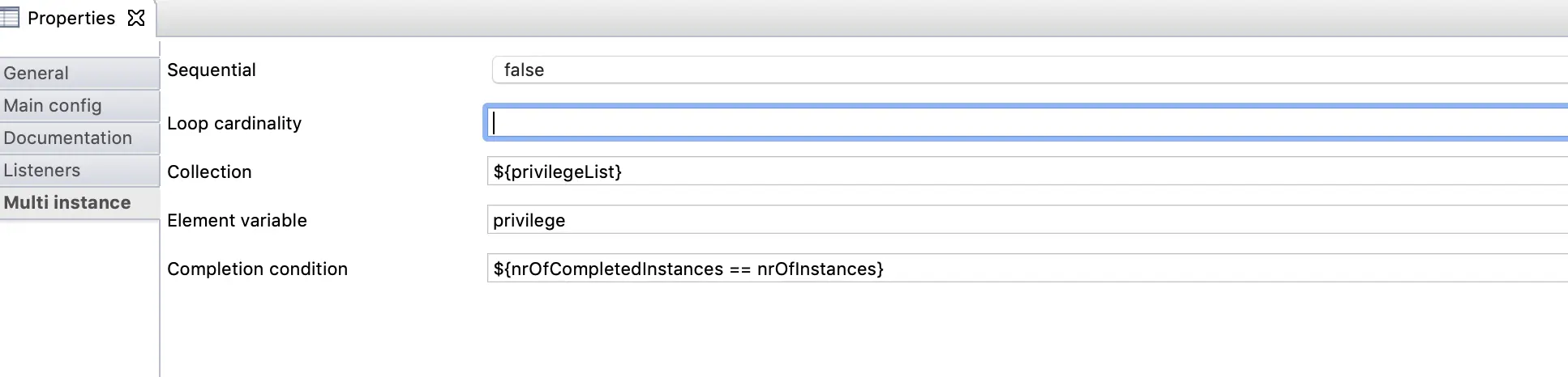 - multi instance多实例页配置,sequential就是配置是同步还是异步的地方,loop 可以直接指定实例个数,这里通过传参解决,定义collection表示会有一个列表名字叫privilegeList的全局参数,列表中每个参数实例的名字叫privilege,completion condition设置完成条件。当创建了多实例后activiti会自动创建多个参数: