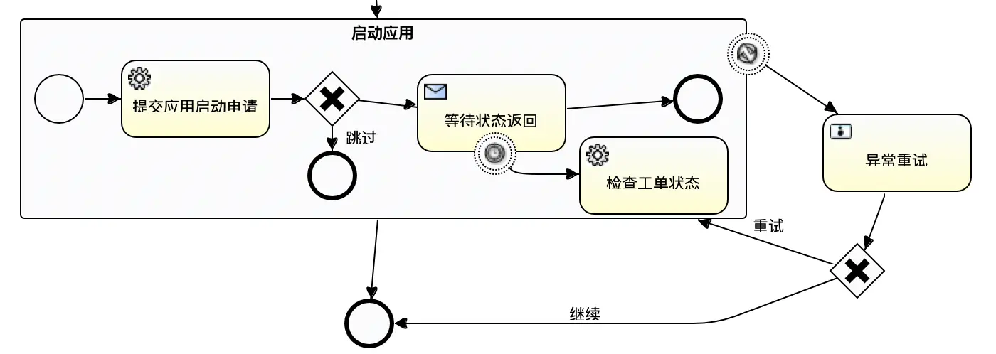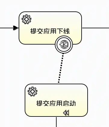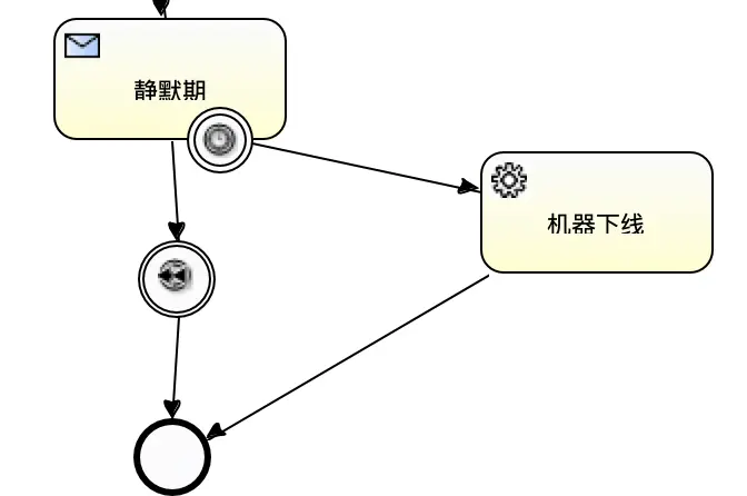 上图的意思是当流程走到静默期这个接收任务的时候会卡住并触发一个边界定时事件,如果定时到了就会走机器下线流程结束,如果定时没到却触发了静默期消息就会走补偿触发事件,触发应用启动,回滚成功。