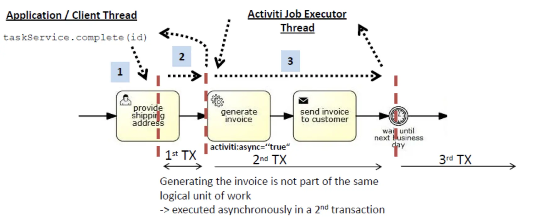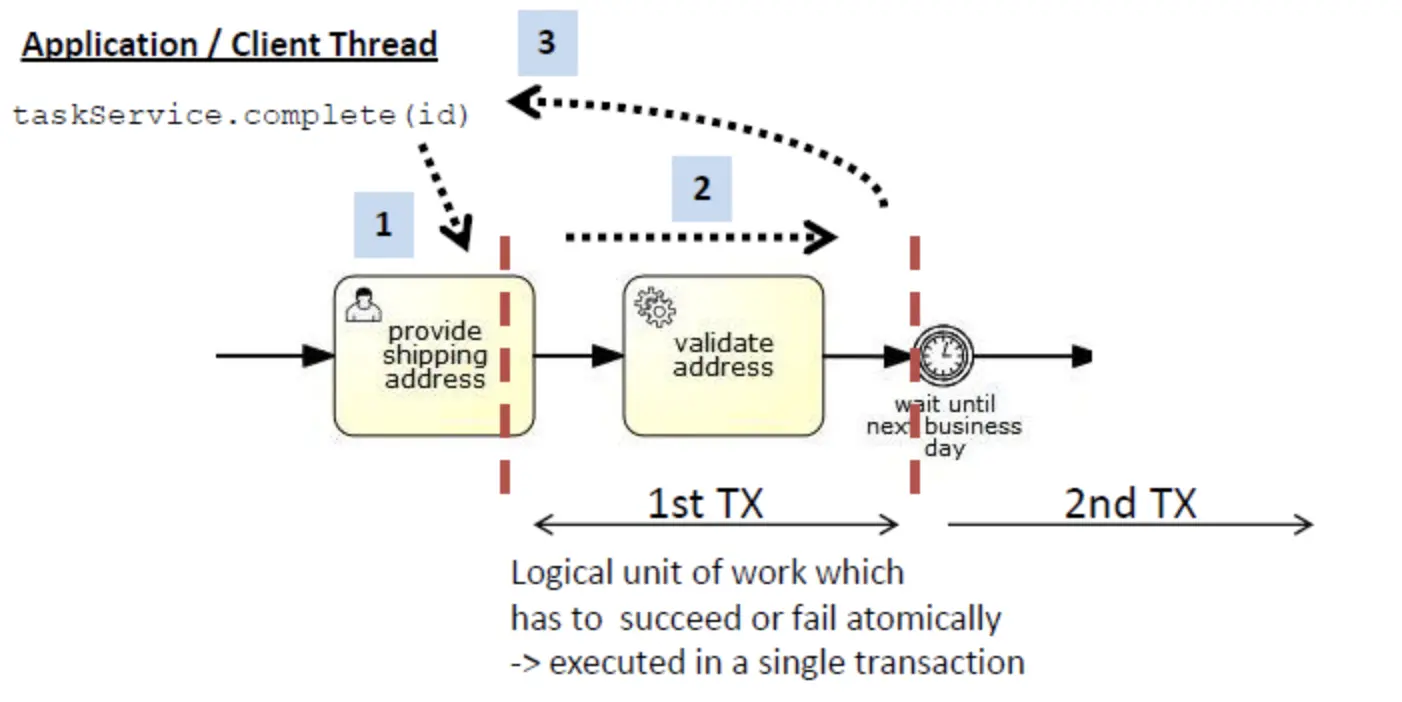 借用官方的图来简要说明一下。activiti是通过事务的方式执行流程,当流程开始后,activit会一直推进流程直到遇到等待状态,然后把当前状态存到数据库,并等待下一次触发。如下图中usertask是第一个等待状态,定时器是第二个等待状态,而完成usertask和执行服务任务在同一个工作单元中,同一个工作单元中的成功和失败是原子的。如果服务任务成功了数据库中看到的是完成的usertask和完成的服务任务,如果服务任务出错了就会导致activti回滚事务,这个时候就会回到最初的状态,现象就是数据库中依然只有未完成的usertask的记录,而看不到服务任务的记录。