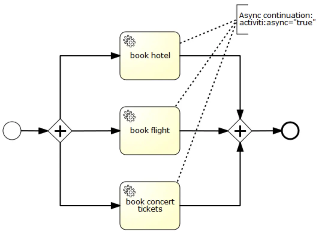 还是借用官方的图,假设有如下场景,三个服务任务都是异步的,jobExecutor会把这3个job分给工作线程池来执行,如果他们同时到达并发汇聚网关那就会出现一致性问题,因为每个分支都会检查其他分支是否到达就会出现一直等待的情况。