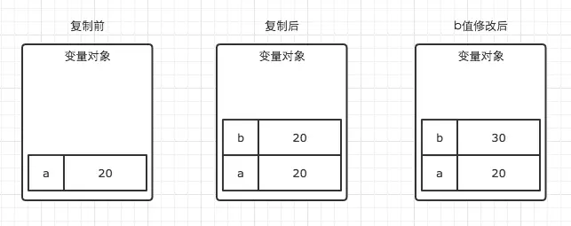 在这个例子中,a、b 都是基本类型,它们的值是存储在栈内存中的,a、b 分别有各自独立的栈空间, 所以修改了 b 的值以后,a 的值并不会发生变化。
