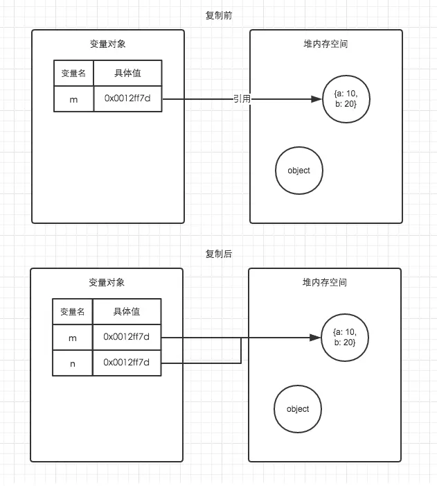 在这个例子中,m、n都是引用类型,栈内存中存放地址指向堆内存中的对象, 引用类型的复制会为新的变量自动分配一个新的值保存在变量中, 但只是引用类型的一个地址指针而已,实际指向的是同一个对象, 所以修改 n.a 的值后,相应的 m.a 也就发生了改变。