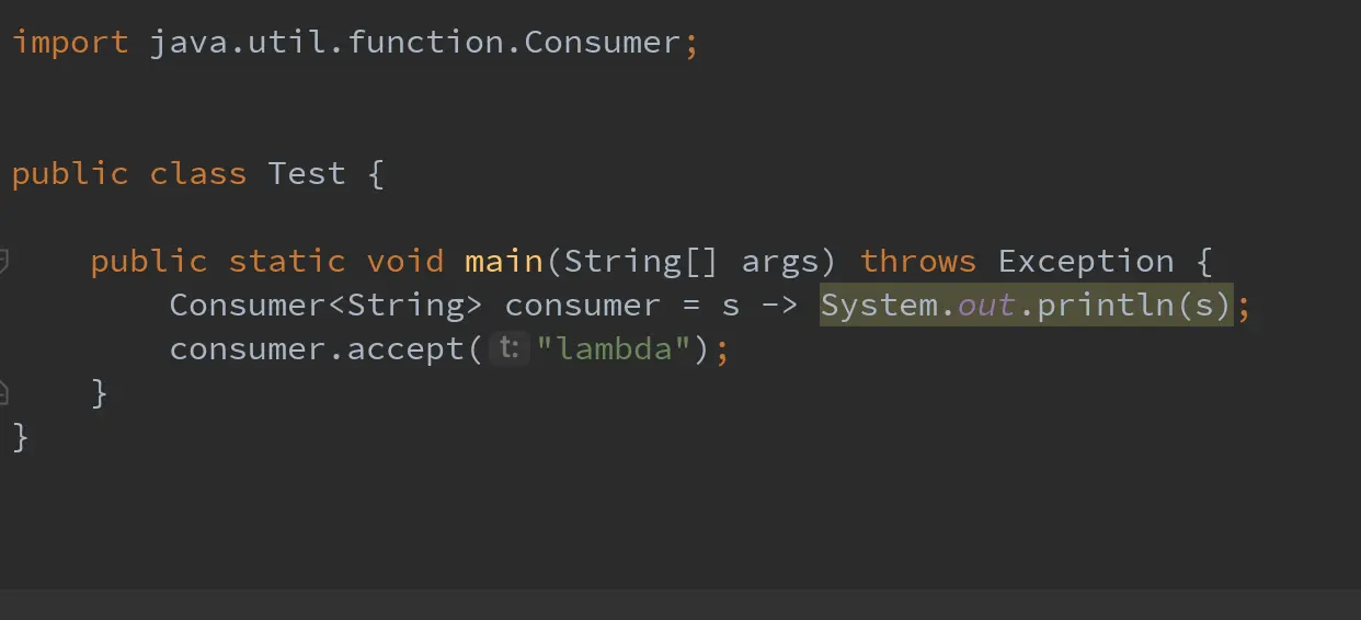 在Lambda表达式实现中,通过invokedynamic指令调用引导方法生成调用点,在此过程中,会通过ASM动态生成字节码,而后利用Unsafe的defineAnonymousClass方法定义实现相应的函数式接口的匿名类,然后再实例化此匿名类,并返回与此匿名类中函数式方法的方法句柄关联的调用点;而后可以通过此调用点实现调用相应Lambda表达式定义逻辑的功能。下面以如下图所示的Test类来举例说明。