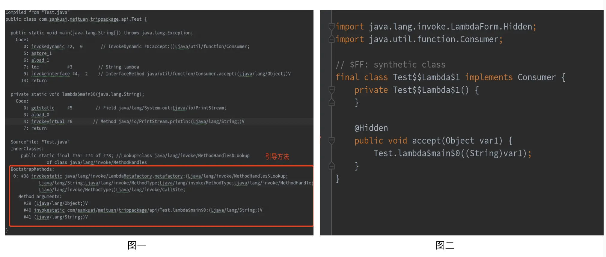 Test类编译后的class文件反编译后的结果如下图一所示(删除了对本文说明无意义的部分),我们可以从中看到main方法的指令实现、invokedynamic指令调用的引导方法BootstrapMethods、及静态方法lambda$main$0(实现了Lambda表达式中字符串打印逻辑)等。在引导方法执行过程中,会通过Unsafe.defineAnonymousClass生成如下图二所示的实现Consumer接口的匿名类。其中,accept方法通过调用Test类中的静态方法lambda$main$0来实现Lambda表达式中定义的逻辑。而后执行语句consumer.accept("lambda")其实就是调用下图二所示的匿名类的accept方法。