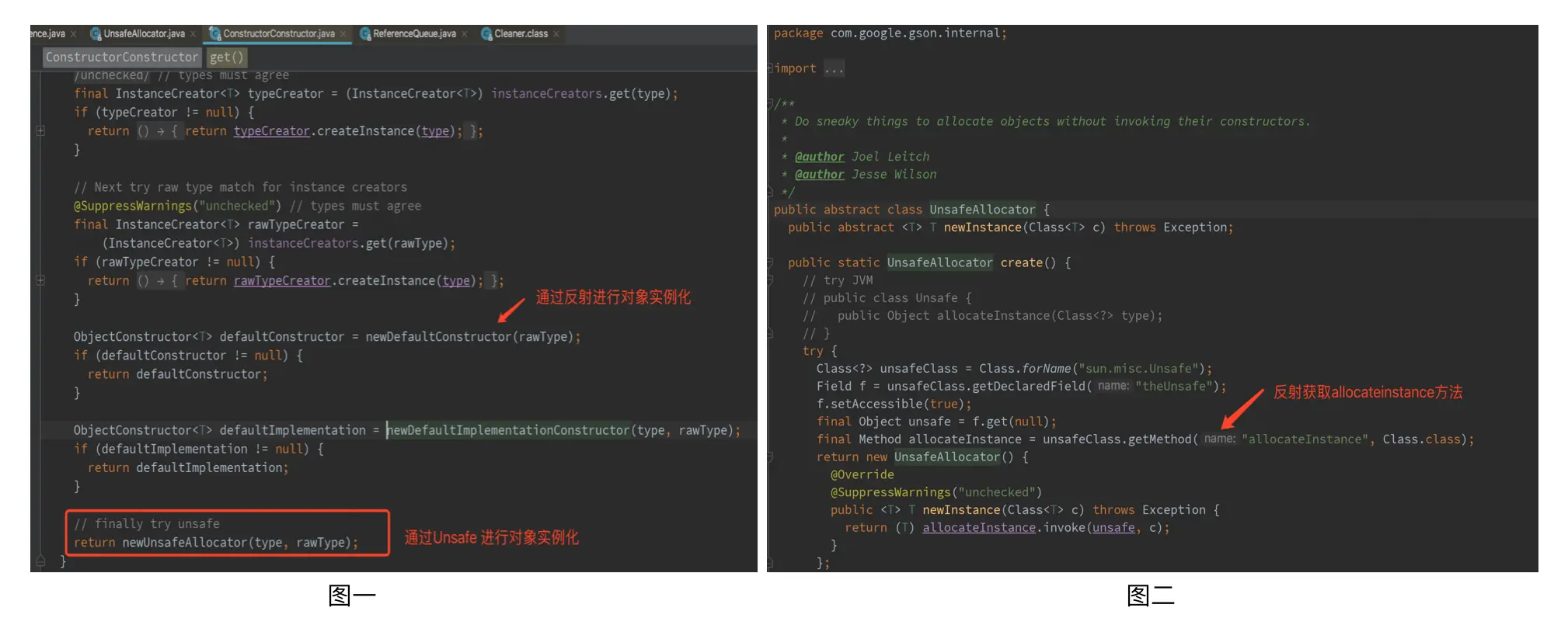 如下图所示,在Gson反序列化时,如果类有默认构造函数,则通过反射调用默认构造函数创建实例,否则通过UnsafeAllocator来实现对象实例的构造,UnsafeAllocator通过调用Unsafe的allocateInstance实现对象的实例化,保证在目标类无默认构造函数时,反序列化不够影响。