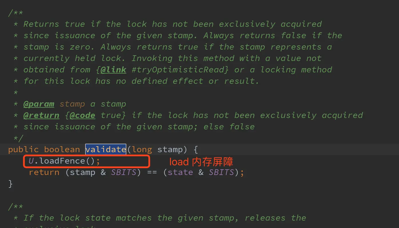 下图为StampedLock.validate方法的源码实现,通过锁标记与相关常量进行位运算、比较来校验锁状态,在校验逻辑之前,会通过Unsafe的loadFence方法加入一个load内存屏障,目的是避免上图用例中步骤②和StampedLock.validate中锁状态校验运算发生重排序导致锁状态校验不准确的问题。