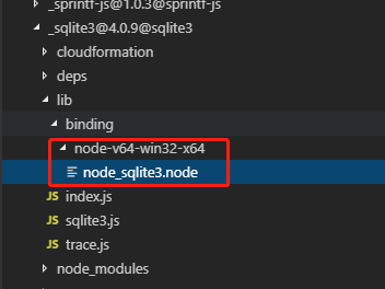 原因是npm install时加载package.json是会在node_modules下安装原生sqlite3模块,binding下会产生一个类似node-v51-win32-x64的文件夹,这个时候我们按照提示去node_module下找到这个路径发现是如图的文件: