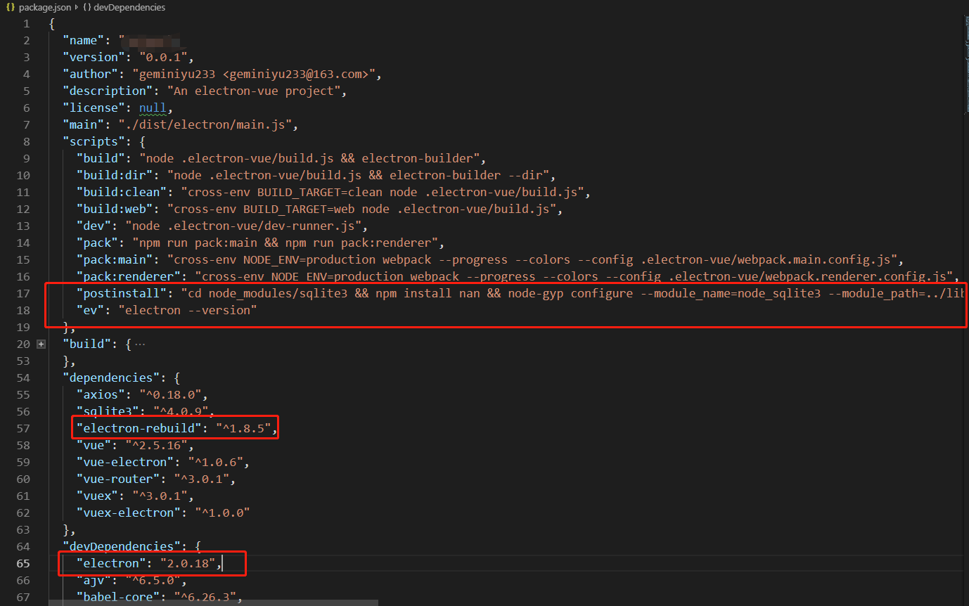 注意:"postinstall": "cd node_modules/sqlite3 && npm install nan && node-gyp configure --module_name=node_sqlite3 --module_path=../lib/binding/electron-v1.4-win32-x64 && node-gyp rebuild --target=2.0.18 --arch=x64 --target_platform=win32 --dist-url=https://atom.io/download/atom-shell --module_name=node_sqlite3 --module_path=../lib/binding/electron-v2.0-win32-x64"
