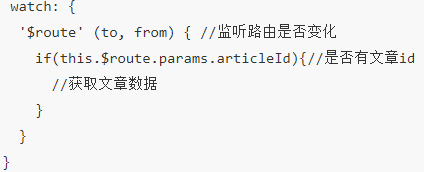 场景:比如文章详情数据,依赖路由的params参数获取的(ajax写在created生命周期里面),因为路由懒加载的关系,退出页面再进入另一个文章页面并不会运行created组件的生命周期,导致文章数据还是上一个文章的数据。 解决办法:watch监听路由是否变化