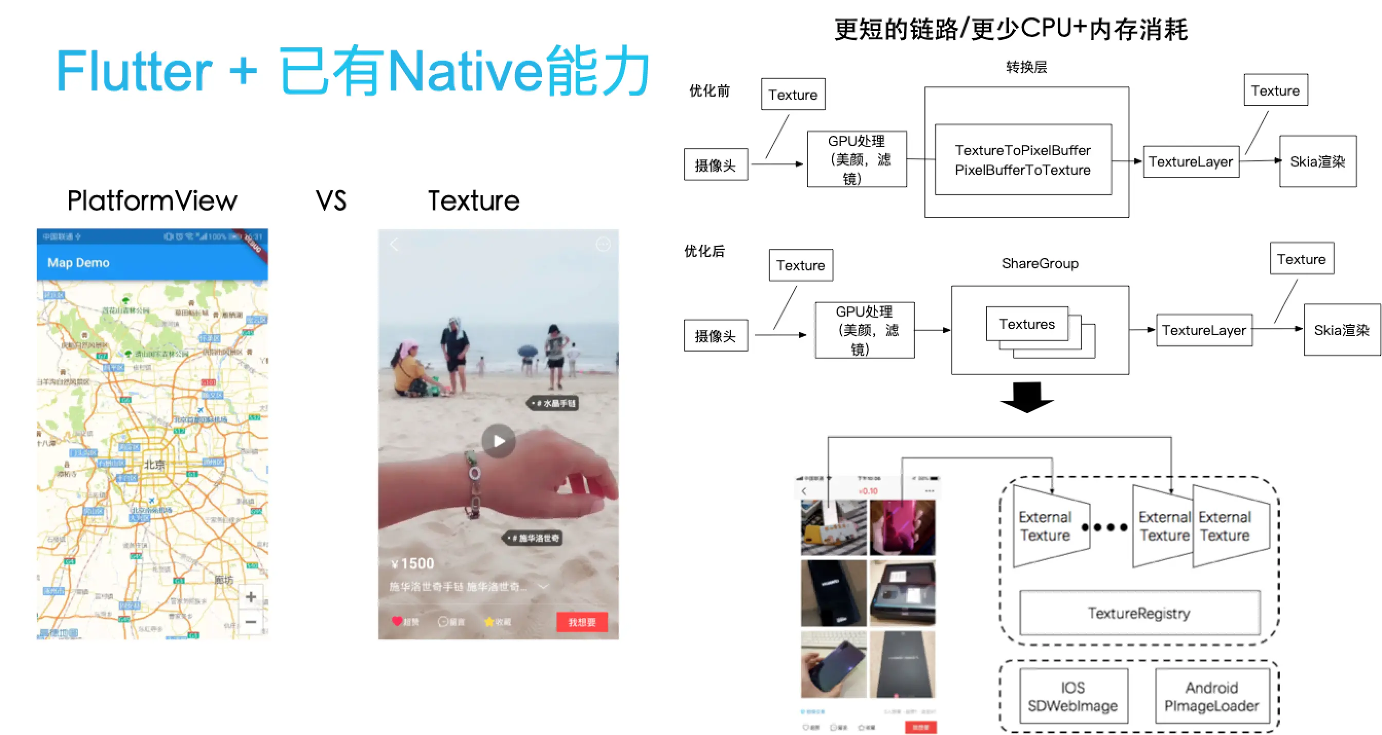 在整个的Native UI到Flutter渲染引擎桥接的过程中,我们选用了Flutter Plugin中提供的FlutterTextureRegistry的能力,在去年上半年我们优先针对视频的场景进行了优化,优化的思路主要是针对Flutter Engine底层的外接纹理接口进行修改,将原有接口中必须传入一个PixelBuffer的内存对象这一限制做了扩展,增加一个新的接口保证其可以传入一个GPU对象的TextureID。