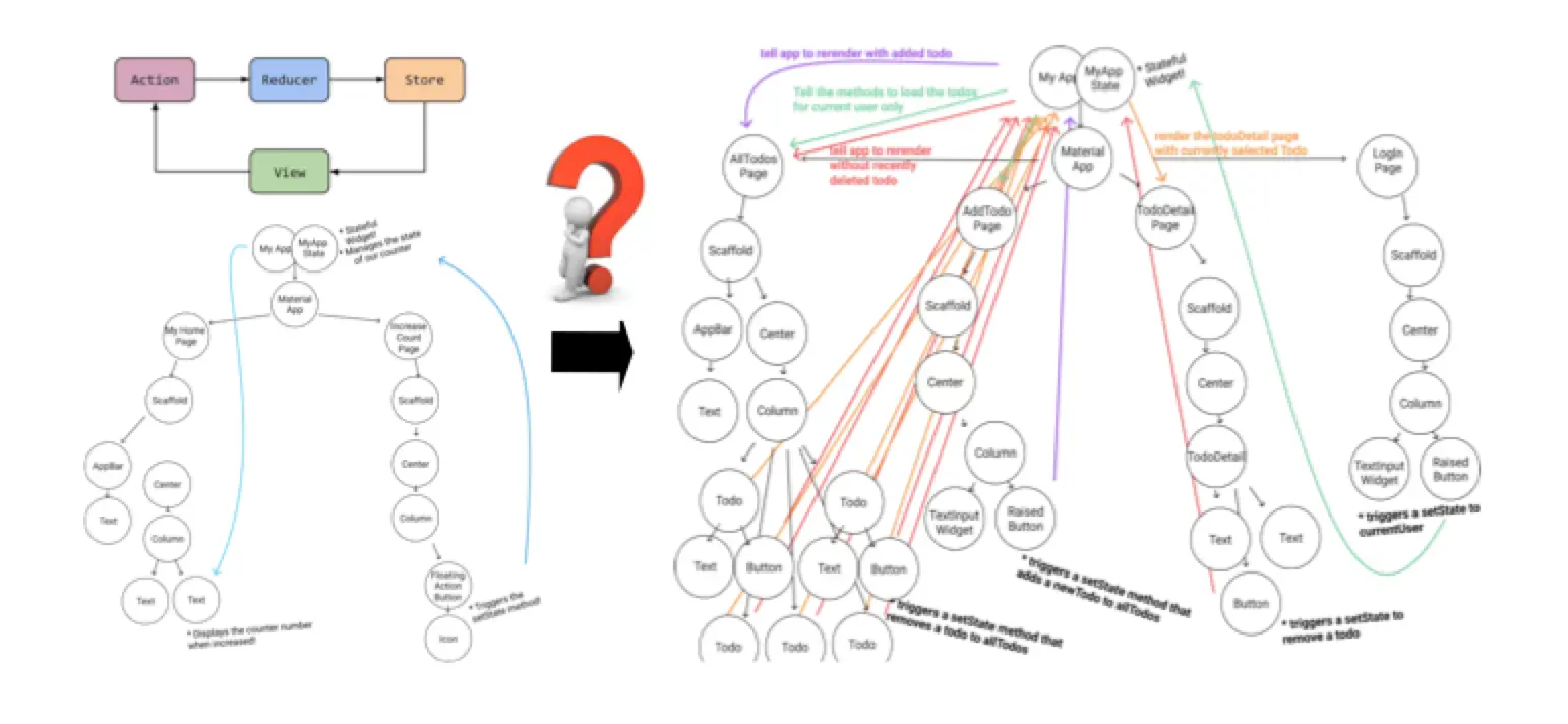 在方案的前期,我们使用了社区的Flutter Redux方案,由于最先落地的详情,发布等页面较为复杂,因此我们有针对性的对View进行了组件化的拆分,但由于业务的复杂性,很快这套方案就出现了问题,对于单个页面来说,State的属性以及Reducer的数量都非常多,当产生新需求堆叠的时候,修改困难,容易产生线上问题。