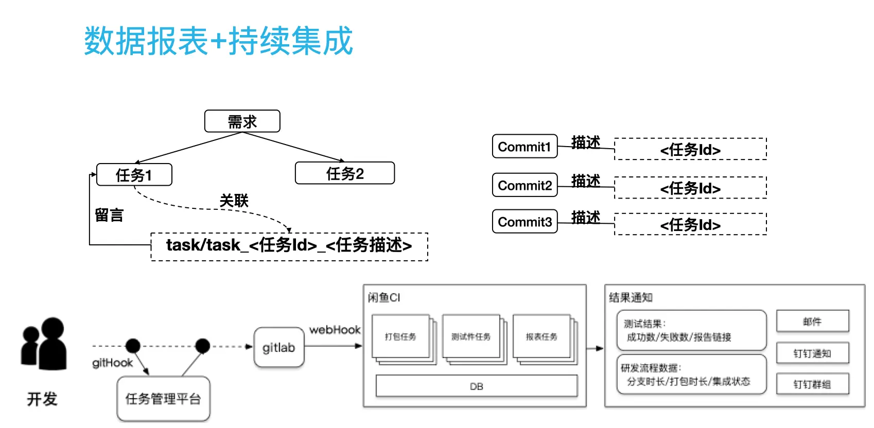 在痛定思痛以后,我们认为数据化+自动化是解决这些问题的一个较好的思路。因此我们首先从源头对代码进行管控,通过commit,将代码与后台的需求以及bug一一关联,对于不符合要求的commit信息,不允许进行代码合并,从而保证了后续数据报表分析的数据源头是健康的。