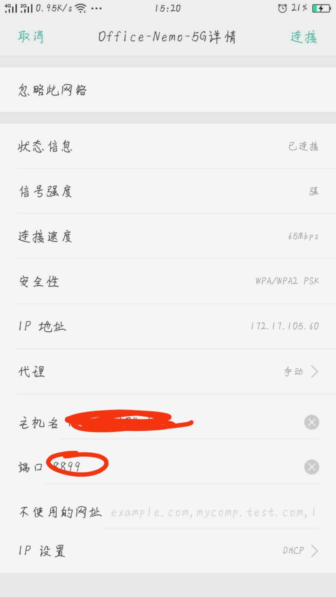 手机和电脑连接同一个wifi,在手机的wifi上设置代理,以下图为例,主机名为电脑的ip,端口号为whistle的启动端口8899