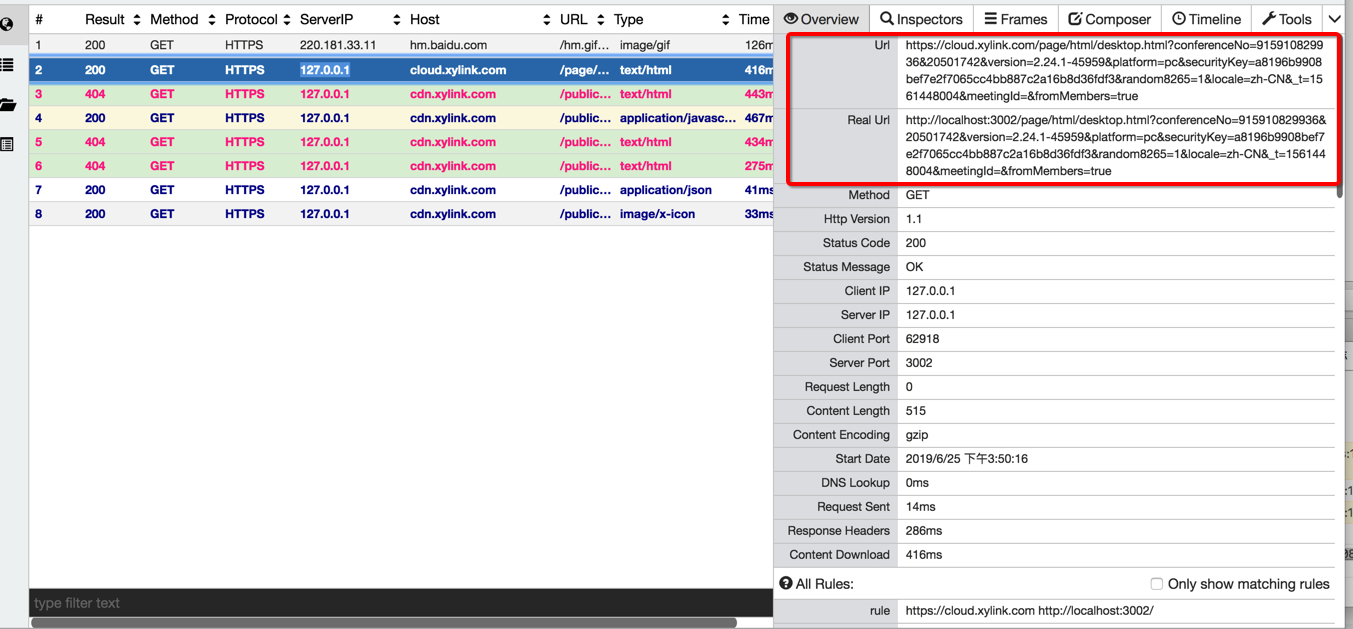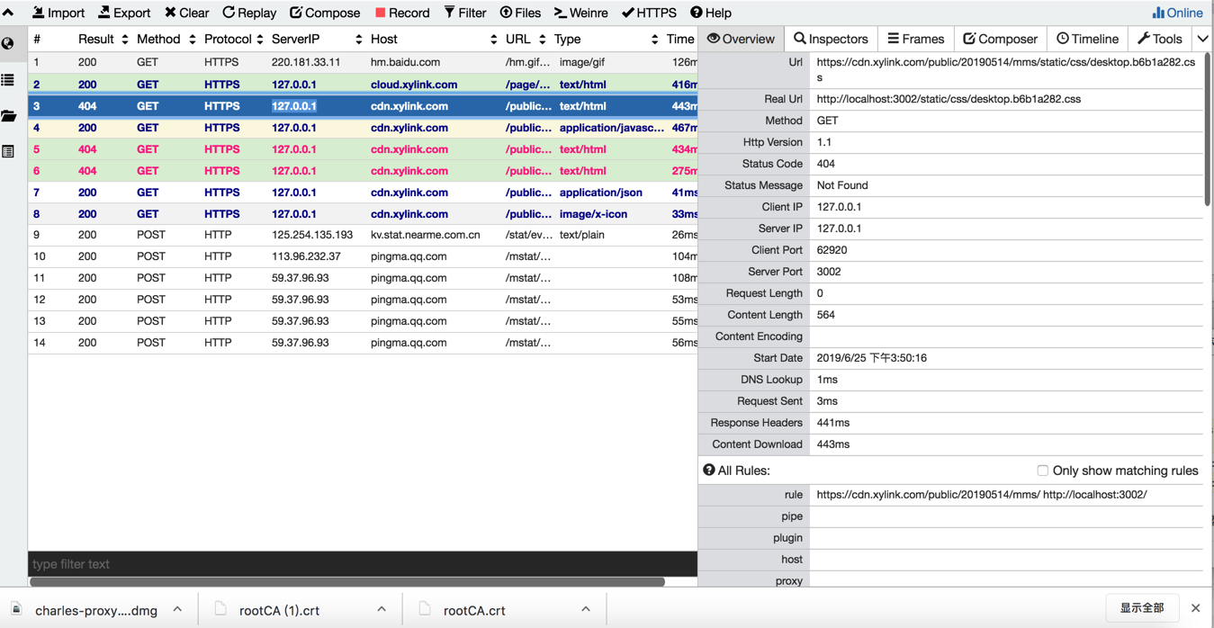 比如下图中的配置代表将cloud.xylink.com的请求和https://cdn.xylink.com/public/20190514/mms/的请求转向本地的3002端口(这里之所以是3002端口是因为我本地webpack启动的项目是3002端口,这个根据自己启动的项目所监听的端口而定)