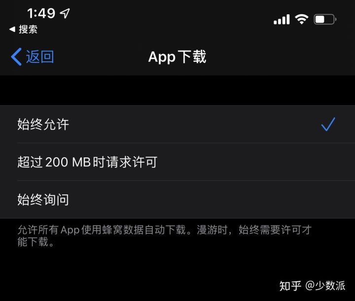 此前 iOS 禁止用户在未连接 Wi-Fi 的情况下下载容量大于 150M 的应用。好在,iOS 13 开放了这一限制,系统不仅默认将这一上限提升到 200M,你还可以在「设置 - iTunes Store 与 App Store - App 下载」选项中将这一限制改为「始终允许」以彻底解除限制。