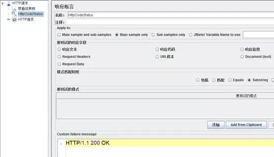 在接口测试用例中得有断言,没有断言的接口用例是无效的,一个接口的断言有三个层面,一个是HTTP状态码的断言,另外一个是业务状态码的断言,最后是某一接口请求后服务端响应数据的断言。在Jmeter中增加断言的方式是右键测试用例点击断言,在断言中点击响应断言, 在响应断言中,要测试的模式填写内容:HTTP/1.1 200 OK,要测试的响应字段勾选Response Headers,模式匹配规则选择Substring,把该响应断言命名为HttpCodeStatus,并且把把响应断言放在全局的位置,见截图: