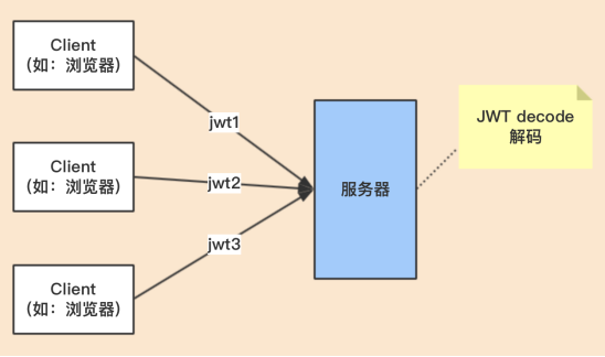 这个流程小伙伴们有没有发现,用户信息是放在JWT中的,是存放在客户端(cookie,local storage)中的,服务器只需解码验证就行了,就可以知道获取到用户信息。而我们之前的Session方式就不一样。
