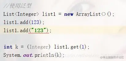 可在main方法里执行以上代码,编译器并不会报错,但执行的时候会出现类的强制转换错误,这里的创建了ArrayList的实例,即默认为Object,所以无论是123还是“123”都被当初object添加,但是,取出的时候会被自动强转成添加进去的类型,即list.get(1)取出的是String类型,而String类型是不能强转成Integer类型的。