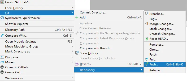 如果选择Commit提交本地后,则可以用Git->Repository->Push推送到GitHub