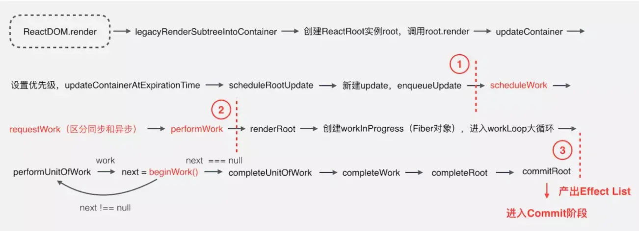 scheduleWork、requestWork、performWork,即安排工作、申请工作、正式工作三部曲,React 16 新增的异步调用的功能则在这部分实现,这部分就是 Schedule 阶段,前面介绍的 Cooperative Scheduling 就是在这个阶段,只有在这个解决获取到可执行的时间片,第三部分才会继续执行。具体是如何调度的,后面文章再介绍,这是 React 调度的关键过程。 - 第三部分是一个大循环,遍历所有的 Fiber 节点,通过 Diff 算法计算所有更新工作,产出 EffectList 给到 commit 阶段使用,这部分的核心是 beginWork 函数,这部分基本就是 Fiber Reconciler ,包括 reconciliation 和 commit 阶段。